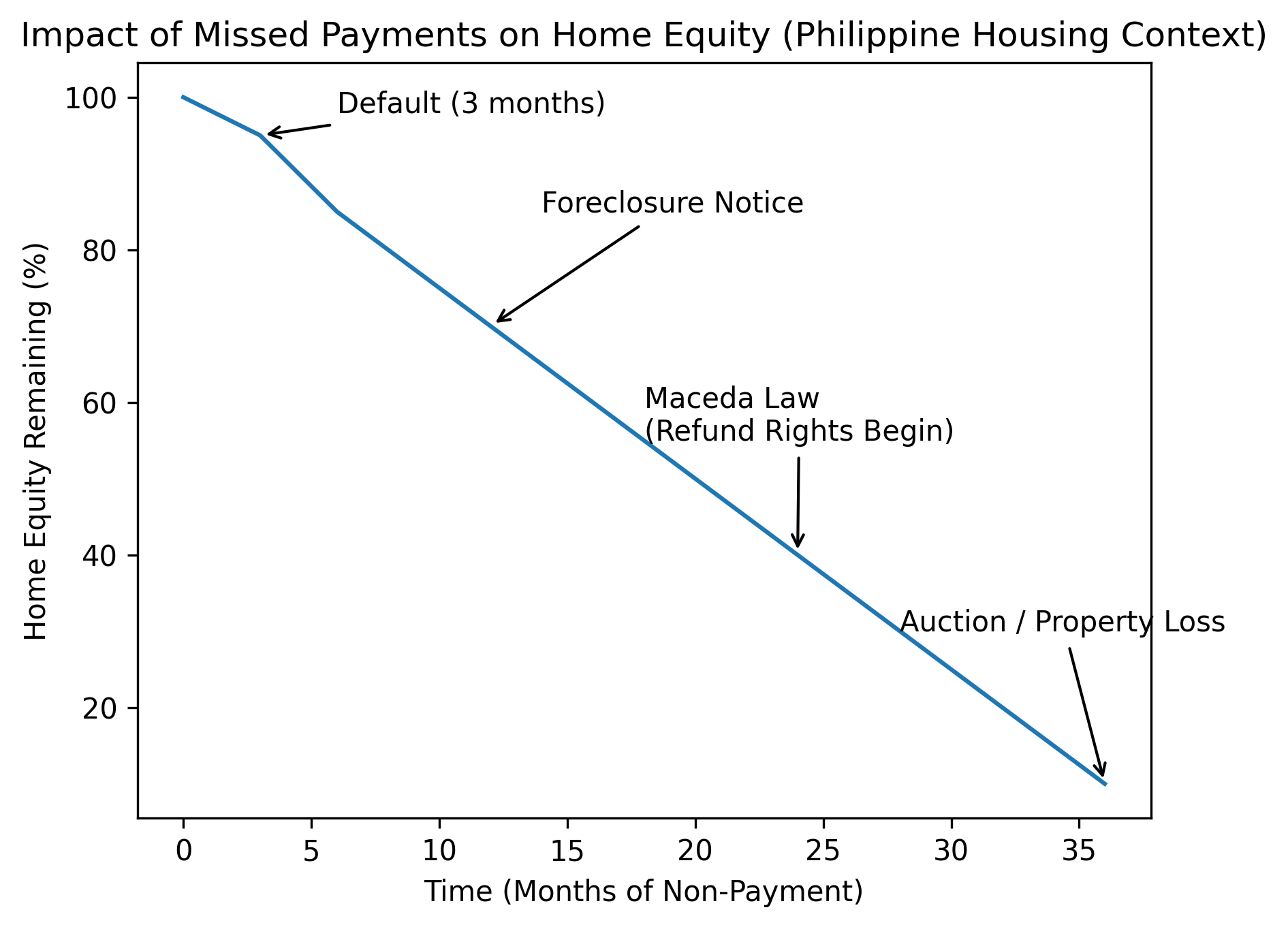 - Downward trend: Illustrates that as missed payments continue, equity is reduced due to penalties, interest, legal fees, and foreclosure risk.